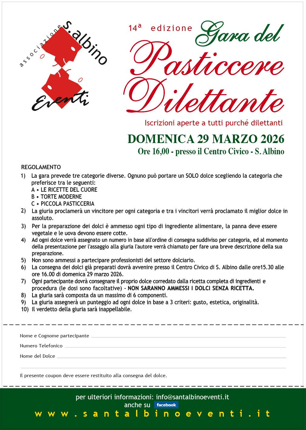 Anche quest’anno, a sfidarsi saranno pasticcieri, rigorosamente dilettanti, che dovranno portare il proprio dolce presso il Centro Civico di S.Albino dalle ore 15.30 alle ore 16.00 di domenica.